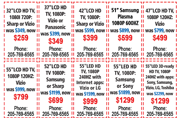 | I purchased a 50 inch 1080p Panasonic Viera Plasma $799 out the door. At the time it was $1,600 at Best Buy. One year later it was still selling for around $1,200. For me personally, I will never buy a tv from anyone other retailer or website than TV OUTLET in Pelham! just doesn't make any sense. Andy, Alabaster,Al |